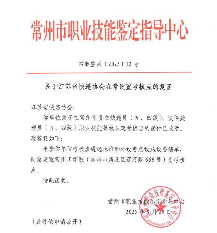 近日,常州市职业技能鉴定指导中心正式复函江苏省快递协会,同意在我校设立职业技能等级认定考核点。这一资质的获批,标志着我校正式成为江苏省物流快递行业高技能人才重要评价基地,是学校深化产教融合、服务地方行业发展的又一举措。