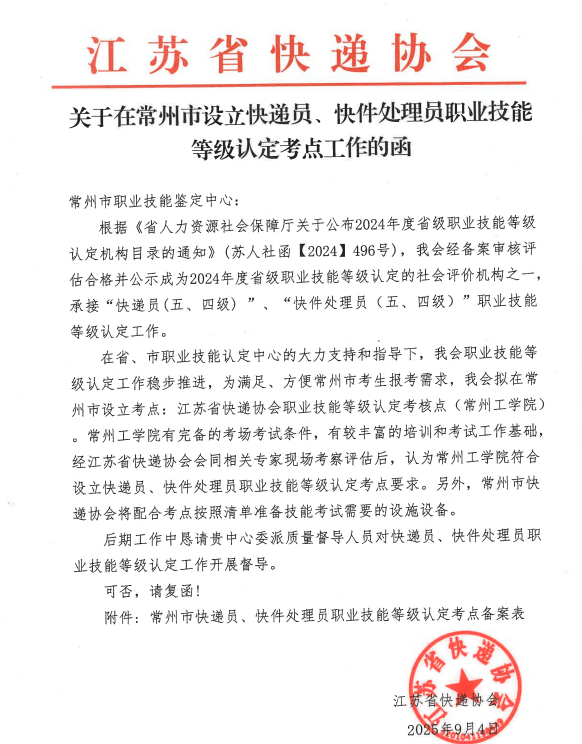 该考核点由江苏省快递协会主导,常州市快递协会协同,并依托我校完善的硬件设施与丰富的教学经验共同建设。根据复函,考核点设于我校辽河路校区,将面向全市及周边地区开展快递领域的职业技能等级认定工作,为行业从业者及在校学生提供权威、规范的技能评价通道。
