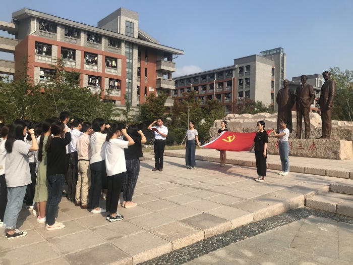 第二单元,瞻仰“常州三杰”,重温入党誓词。9月28日上午,师生党员在辽河路校区三杰广场集合。院党委书记肖华,向大家回顾了“三杰”的光辉历史,要求党员同志们好好学习,传承红色基因,弘扬三杰精神,继往开来,争做新时代新人,而后,全体党员在鲜艳的党旗前,举起右手庄严宣誓。