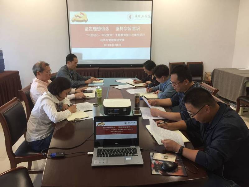10月8日、9日,经济与管理学院党委围绕“坚定理想信念、坚持宗旨意识”和“加强党性修养、廉洁自律”两个主题,分别开展“不忘初心、牢记使命”主题教育第三第四次集中研讨。副书记郭峥春和副院长曹国分别围绕两个主题作主讲。全体党委委员参加集中研讨。