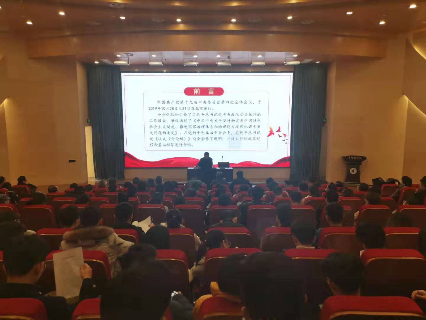 12月4日,航空与机械工程学院/飞行学院举行学习贯彻十九届四中全会精神宣讲报告会。院党委书记尹飞鸿为全体教职员工和学生代表宣讲。