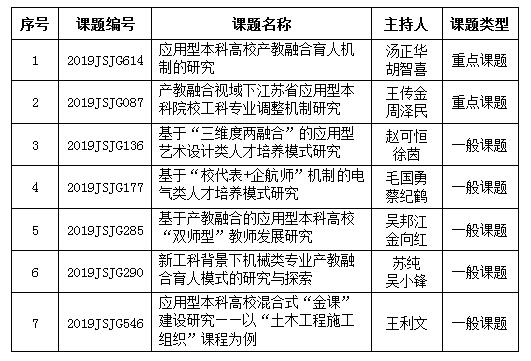 近日,2019年江苏省高等教育教改研究课题评选结果揭晓,共有660项课题获批立项,包括重中之重课题17项、重点课题131项、一般课题512项。我校申报的7项课题均获批立项,其中,重点课题2项,一般课题5项。