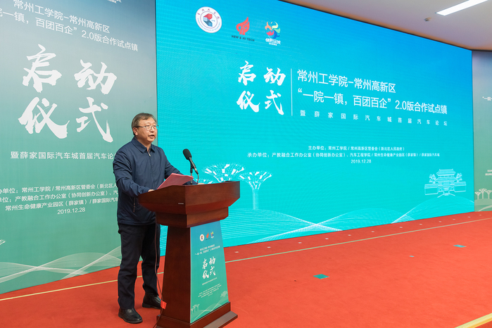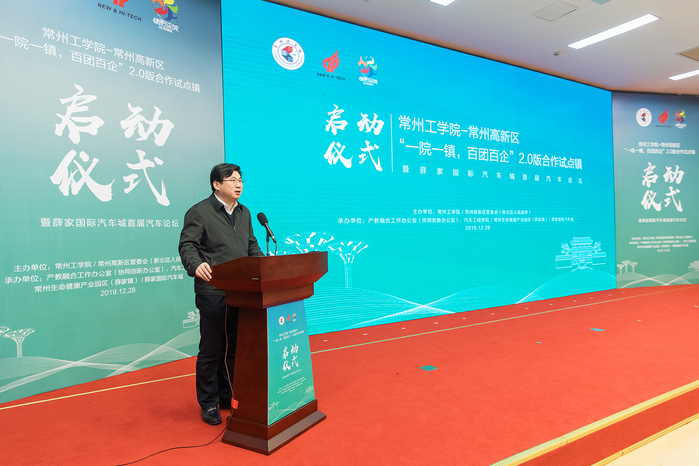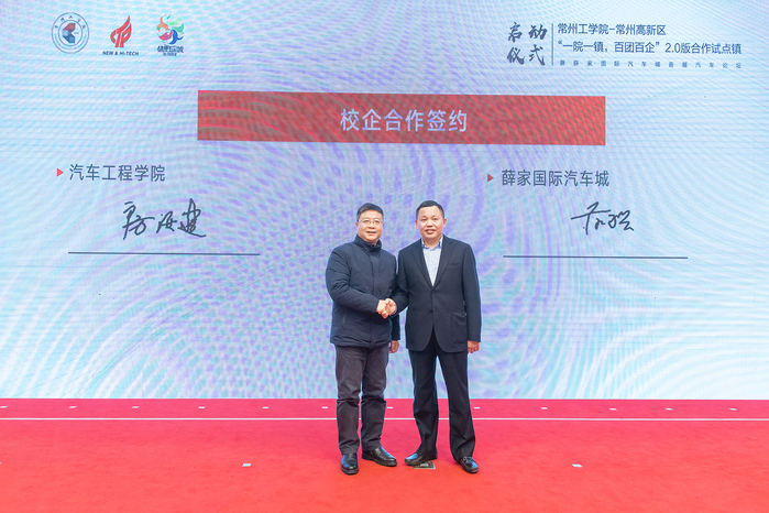12月28日,常州工学院--常州高新区管委会“一院一镇,百团百企”2.0版合作试点启动仪式暨薛家国际汽车城首届汽车论坛在薛家镇政府举行。常州高新区管委会主任、新北区人民政府区长乔俊杰、常州市发展和改革委员会、常州市科技局、常州市工信局、常州市总工会、常州市汽车流通协会、常州市工商业联合会等部门领导、高新区相关部门和镇、街道领导、企业家代表,以及我校党委书记曹雨平,校党委副书记、副校长周全法,相关职能部门负责人、二级学院产教融合工作负责人和师生代表参加活动。启动仪式由生命健康产业园区管理办公室主任、薛家镇党委书记徐俊主持。