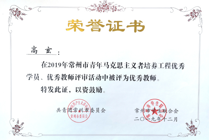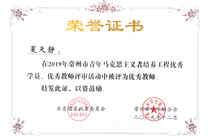 日前,共青团常州市委员会、常州市学生联合会开展的2019年青年马克思主义者培养工程优秀学员、优秀教师评选结果揭晓,我校马克思主义学院院长助理夏天静、高玄被授予“2019年常州市青年马克思主义者培养工程优秀教师”称号。