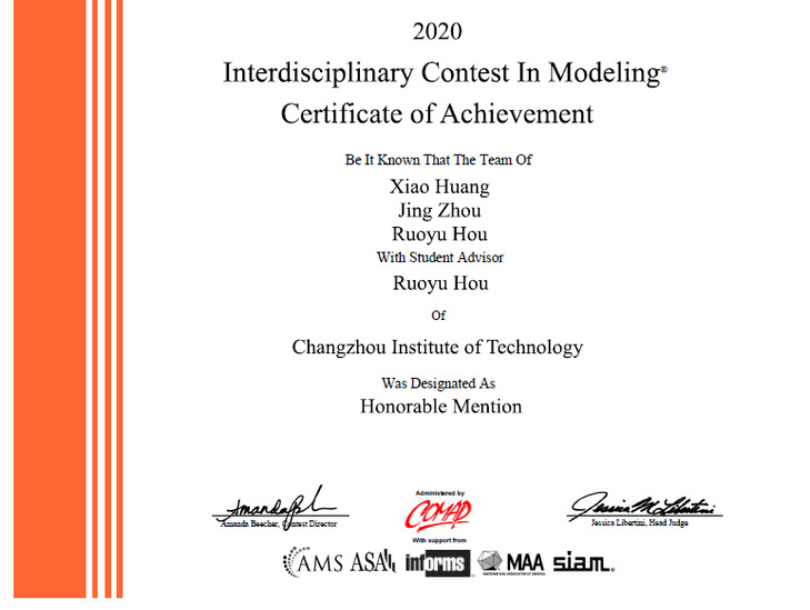 近日,2020年美国大学生数学建模竞赛(MCM/ICM)成绩揭晓。我校理学院周婧(18数二)、土木建筑工程学院黄啸(17土三)、侯若禺(17土三)组成的参赛团队获二等奖(HonorableMention),这是我校学生首次参加国际性数学建模大赛并获奖。该团队曾在理学院夏红卫老师的指导下获得2019年全国大学生数学建模竞赛江苏赛区一等奖。
