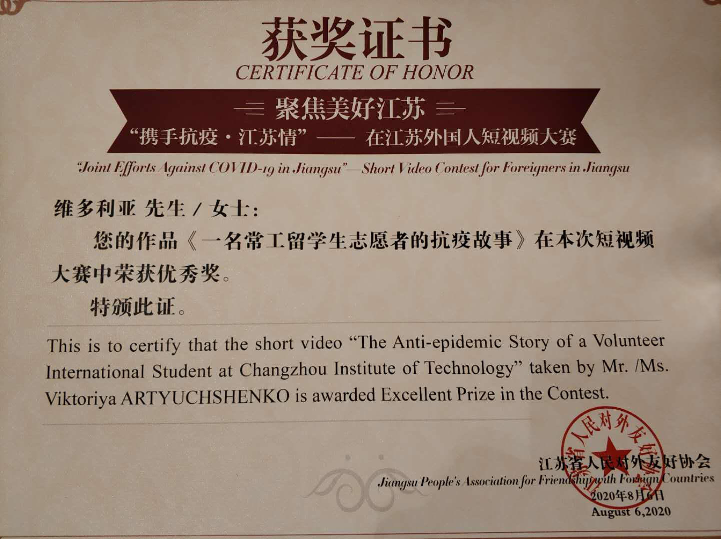 8月6日,由江苏省人民对外友好协会联合新华报业传媒集团举办的“携手抗疫·江苏情”——在江苏外国人短视频大赛颁奖仪式暨视频发布会在南京举行,我校选送的视频作品《一名常工留学生志愿者的抗疫故事》从133件参赛作品中脱颖而出,喜获优秀奖。