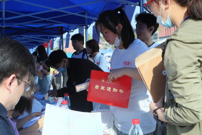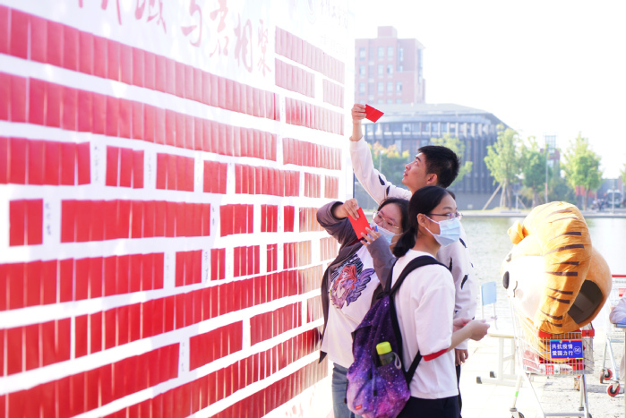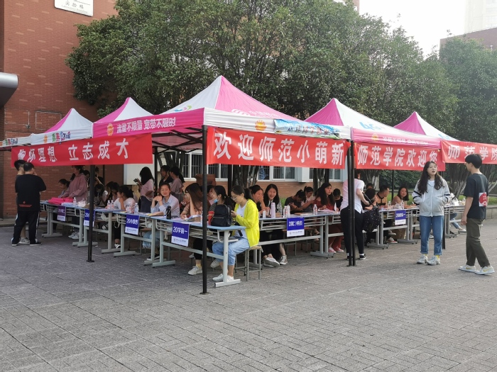 签名墙、拍照框、卡通“小蓝人”……其他二级学院也以形式简朴而情真意切的方式,给新生留下了难忘的大学生活最初体验。