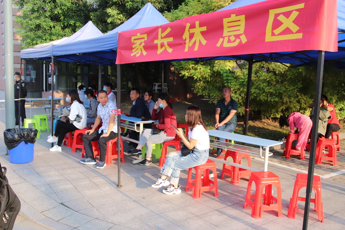 与此同时,学校还专门为在休息区等待的家长们准备了小点心、矿泉水等食品,以及移动厕所等便利设施。