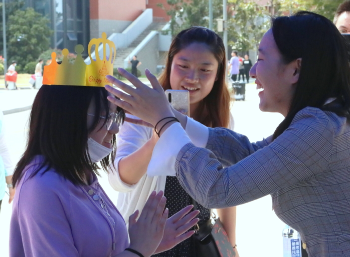 理学院的“探寻理学大师,推崇科学精神”展板前,用拼图形式拼出数学、统计、大数据等专业领域的大师,让新生们惊喜连连,迅速找到了学习的榜样。当日,恰逢统计2班新生陈祺梅生日,该院为之精心准备了生日蛋糕和小礼物,祝福她生日快乐,学习无忧!