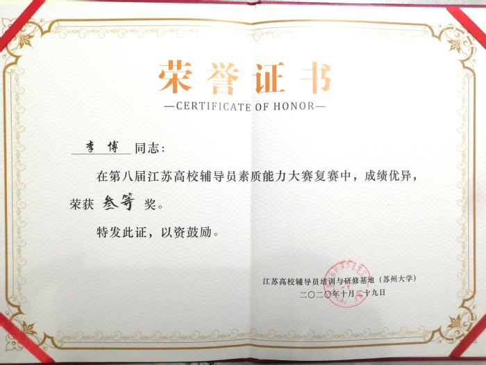 10月29日,第八届江苏省辅导员素质能力大赛基地复赛在苏州大学落下帷幕。经过第一阶段的激烈角逐,我校化工与材料学院辅导员李博顺利进入第二阶段的比赛,并获三等奖。