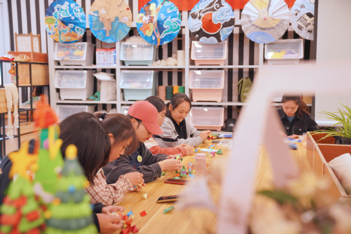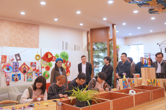 在创意产业展区,艺术创意作品清新淡雅,大学生创业项目板房皮具美观又实用。大学生创业工位区的“造物家”,打造智慧乡村地图,助推新农村建设。师生社区开放课实践环节“创意手工坊”主打非遗纸作品,将课程、社区、教学融合贯通,形成青年大学生服务社会的红色筑梦之旅,感兴趣的同学还亲自动手进行操作。在成果展示区,巫山路校区学院师生各类文化创意产业成果展板成果纷呈、丰富多彩。