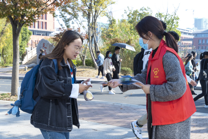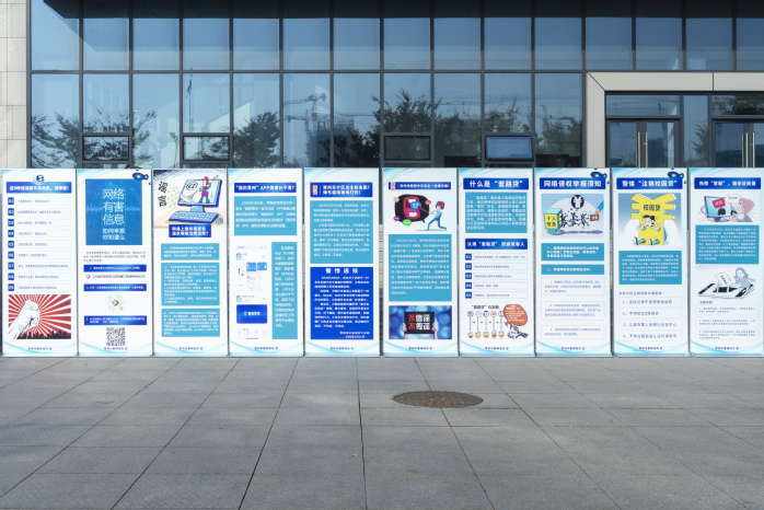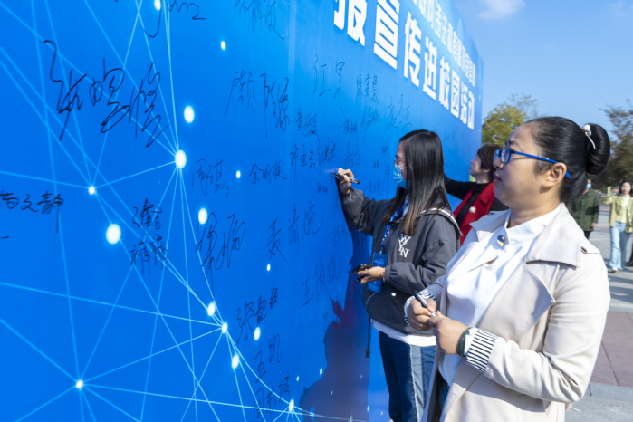 户外活动主要是互联网有害信息鉴别展示和“龙城先锋在E线”网络文明志愿者签名。互联网有害信息鉴别关乎每一个网民,其内容涉及网络违法和不良信息鉴别、如何判断和识别网络谣言、认清 “套路贷”和远离网络诈骗等,这些互联网有害信息鉴别展示与大学生网络生活息息相关,展览和签名也吸引很多路过的学生。