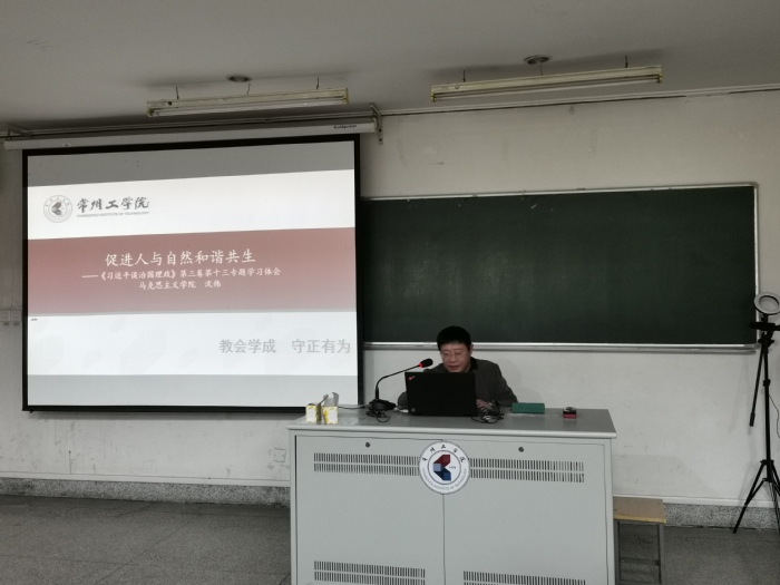 沈伟以“促进人与自然和谐共生——《习近平谈治国理政》第三卷第十三专题学习体会”与大家分享。他从道法自然、天人合一的思想渊源、经济增长方式和经济发展方式的历史依据、回应人民日益增长的美好生活的需求、筑基永续发展和伟大复兴、共建美丽时间的现实意义等方面进行了阐述。他强调要时刻牢记习近平总书记的讲话:坚持绿水青山就是金山银山 、坚持良好生态环境是最普惠的民生福祉、坚持山水林田湖草是生命共同体 、坚持用最严格制度最严密法治保护生态环境、坚持共谋全球生态文明建设 。