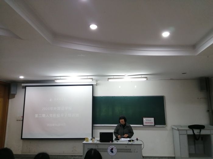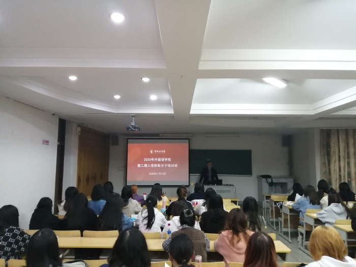 11月14日,外国语学院分党校2020年第二期入党积极分子暨“青马工程”培训班在巫山路校区顺利开班,离退休党工委关一宁、外国语学院党委书记刘一鸣、副书记俞贤辉和学工办主任陆婷为近九十名入党积极分子和学生干部进行专题培训。