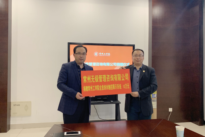 11月13日,常州无极管理咨询有限公司总经理、我校经管与管理学院99届校友王明伟一行来校,向学校捐赠全息纳米触控展示系统(价值10万元)、教学幻灯片各一套。
