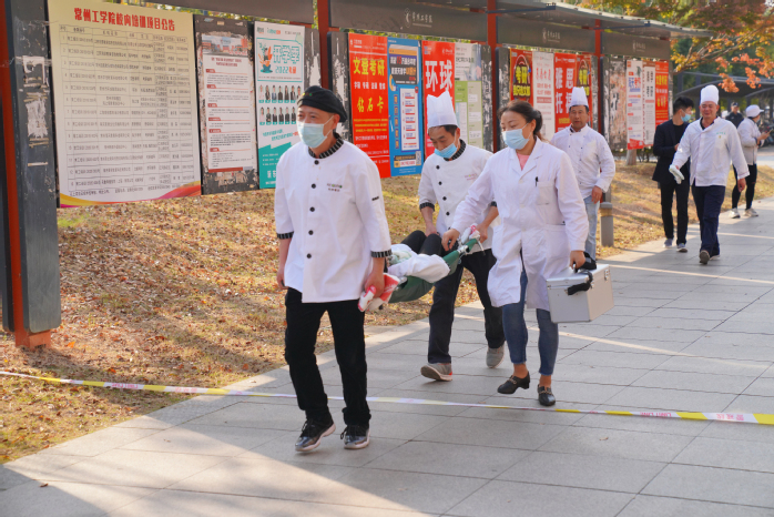 此时警报声响起,应急疏散引导组迅速打开消防疏散通道,食堂负责人一边向食堂内师生员工不断喊话“食堂发生火情,请大家不要慌张、拥挤,马上向外疏散离开食堂”,一边有序组织大家疏散;灭火行动组利用消防器材扑救,努力控制火势;救援、急救行动组及时对“伤员”进行医疗救治;现场警戒组迅速拉起警戒线,维持现场秩序。