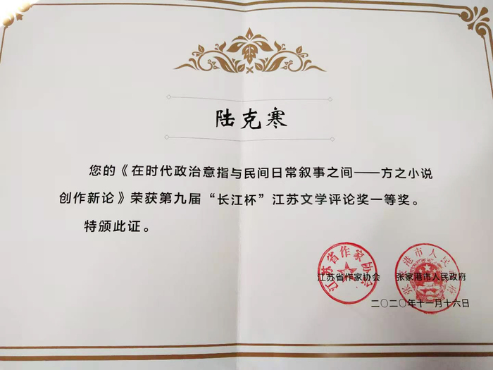 日前,我校陆克寒教授的《在时代政治意指与民间日常叙事之间——方之小说创作新论》获第九届“长江杯”江苏文学评论奖一等奖。