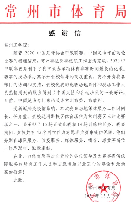 12月3日,常州市体育局向我校发来感谢信,向我校各位领导和为2020中甲联赛提供保障服务的所有工作人员、志愿者表示最崇高的敬意和最衷心的感谢。