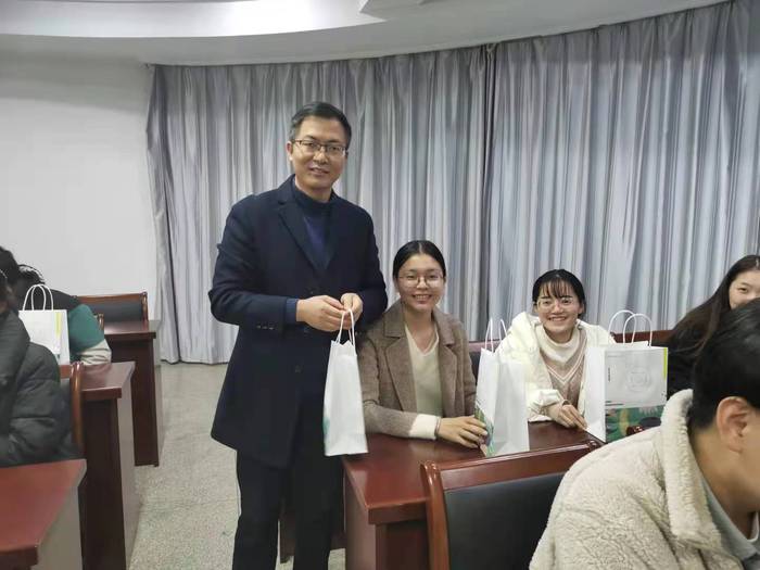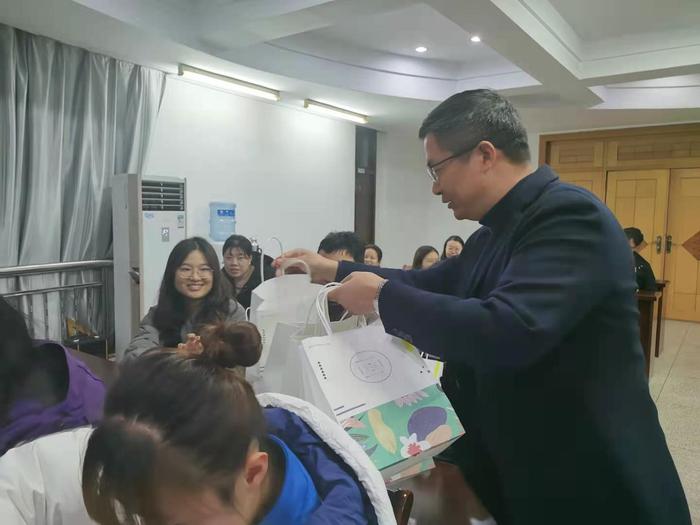 吴健代表学院全体教师表达了对考研学子的关心和问候。他对同学们前期的辛苦付出及良好的学习状态给予了充分肯定和赞扬;希望大家在最后冲刺阶段能安排好时间,调整好节奏,注意劳逸结合;鼓励大家放下包袱,轻装上阵。同时他还强调,学院永远是人文学子的坚强后盾,将尽力为大家排忧解难、提供服务保障。活动最后,吴健亲自为大家送上精心准备的冬日温暖慰问品。