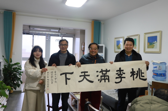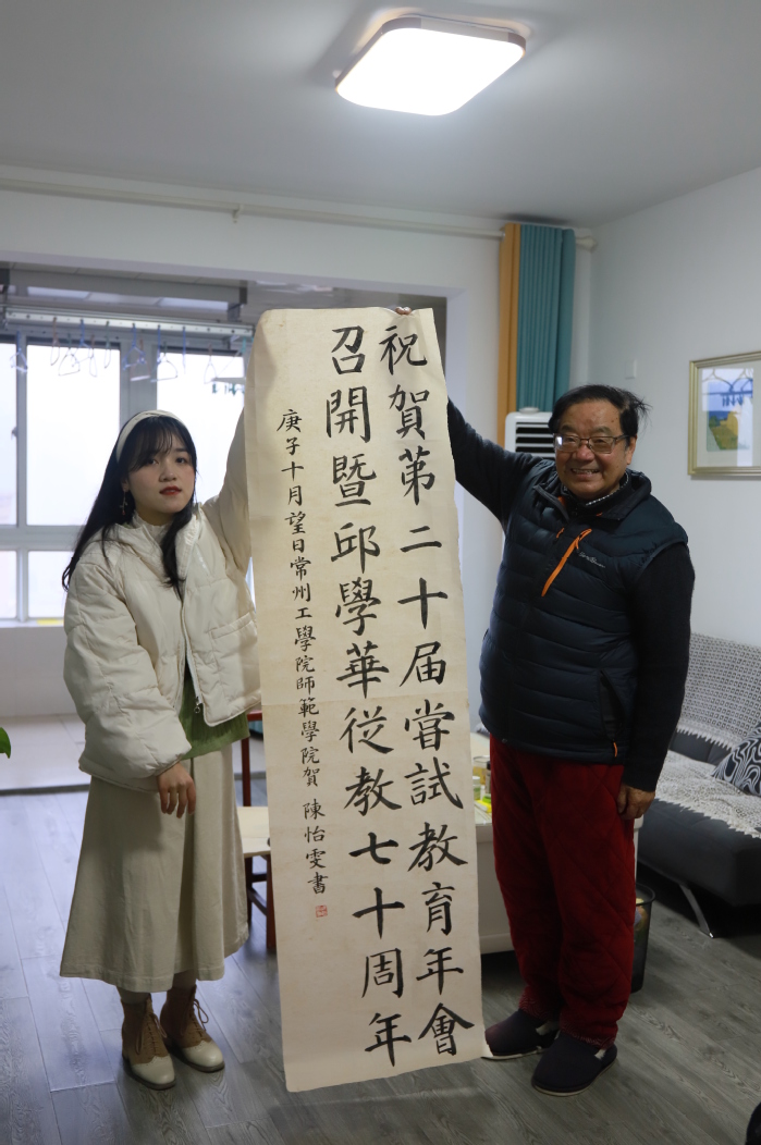 在拜访过程中,肖书记首先对邱老先生及他的夫人表达了深切问候,并为二老送上暖心礼物——围巾,随后,学生代表也为二老献上了亲自书写的书法作品作为“全国20届尝试教育学术年会”的贺礼。
