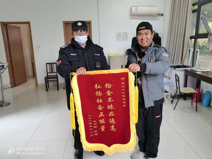12月10日上午,市民武先生将写有“拾金不昧品德高、弘扬社会正能量”的锦旗和送到了常州工学院辽河路校区保安李荣皆手中并连声感谢。他激动地说:“大马路是公共场所,车人众多,能够这么快找回丢失的贵重包裹真实属不易!”他对保安师傅拾金不昧的行为不断地点赞。