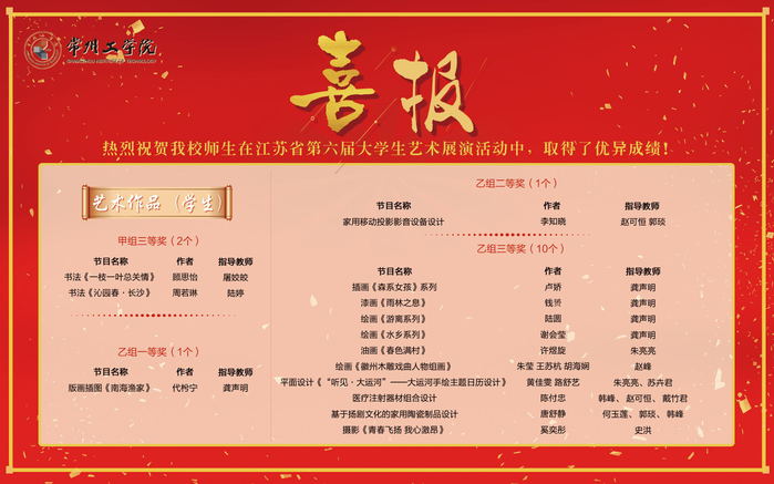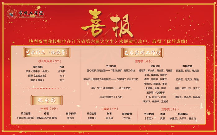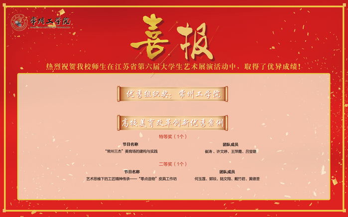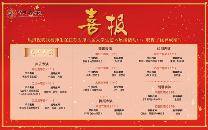 非是金秋结硕果,凛冬虽至捷报传。近日,江苏省教育厅发文公布第六届大学生艺术展演活动获奖名单,我校共有37个作品获奖。其中,高校美育改革创新优秀案例《“常州三杰”美育场的建构与实践》荣获特等奖,大合唱《城南送别》等3个项目荣获一等奖,群舞《你的微笑》、戏剧表演《瞿秋白和张太雷》、微电影《傩舞》等5个项目荣获二等奖。同时,学校被授予“优秀组织奖”。