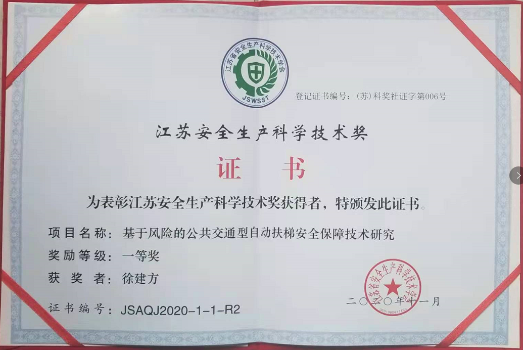 近日,我校老科协会员徐建方开展的“基于风险的公共交通型自动扶梯安全保障技术研究”项目荣获江苏省安全生产科学技术学会颁发的“江苏安全生产科学技术奖一等奖”。