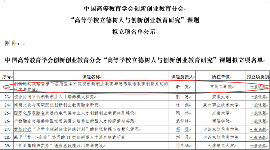 这是继我校完成江苏教育系统2020年“奋进之笔”行动项目——“高水平应用型人才培养创新创业教育体系建设”之后,获批的高层次创新创业教育教研课题。该课题设计思路是结合应用型本科院校实际,通过构建创新创业教育与思想政治课程教育的融合机制,探索双创教育与思政教育同行同向发展的路径,以达到价值互鉴、协同育人的目的。