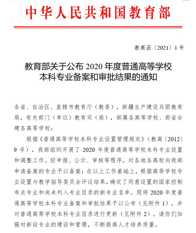 近日,教育部发布《关于公布2020年度普通高等学校本科专业备案和审批结果的通知》(教高函〔2021〕1号),我校申报的智能制造工程(080213T)和资源循环科学与工程(081303T)两个新工科专业成功通过教育部备案。我校本科专业数量已达58个。