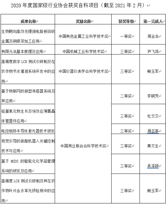 近日,2020年度各类国家级行业协会科技学技术奖陆续公布。据统计,截至目前我校自科成果共获奖11项(第一完成单位9项),覆盖了电子信息、机械、材料与化工、能源动力等重点建设学科。