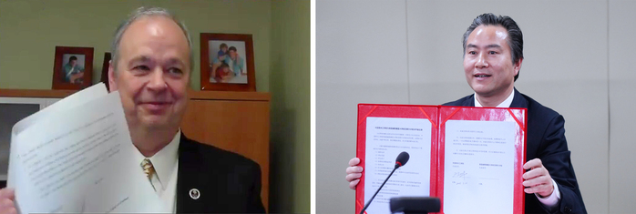 3月12日,校长汤正华和美国威斯康星大学欧克莱尔分校(UWEC)校长詹姆斯•施密特通过视频连线的方式,代表两校签署合作谅解备忘录和商务英语(国际商务)专业联合培养协议书。副校长张兵、外国语学院和国际交流合作处相关负责人等共同见证“云”签约。