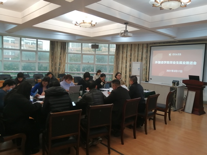 3月17日下午,外国语学院召开2021届毕业生就业工作推进会。院党委书记刘一鸣、党委副书记俞贤辉、各专业系主任、2021届毕业班班主任和全体辅导员参加会议。