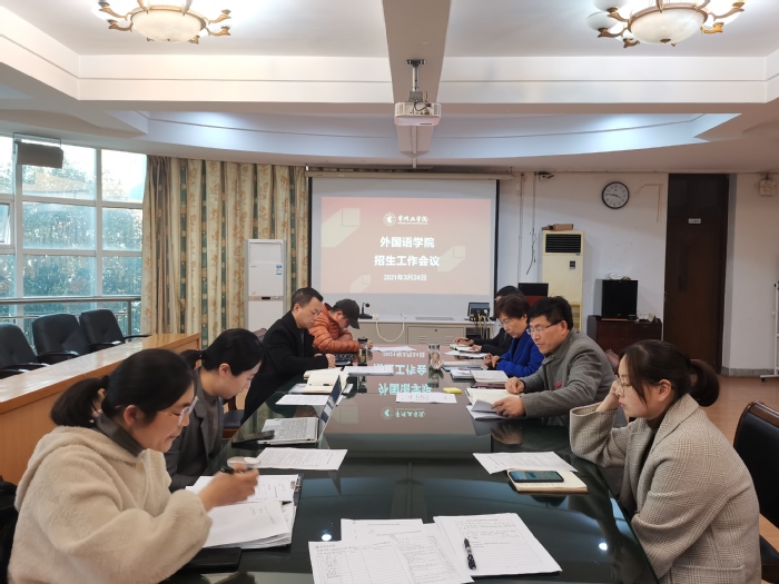 3月24日下午,外国语学院召开2021年招生工作会议。全体院领导和系部主任参加,院长李静主持会议。