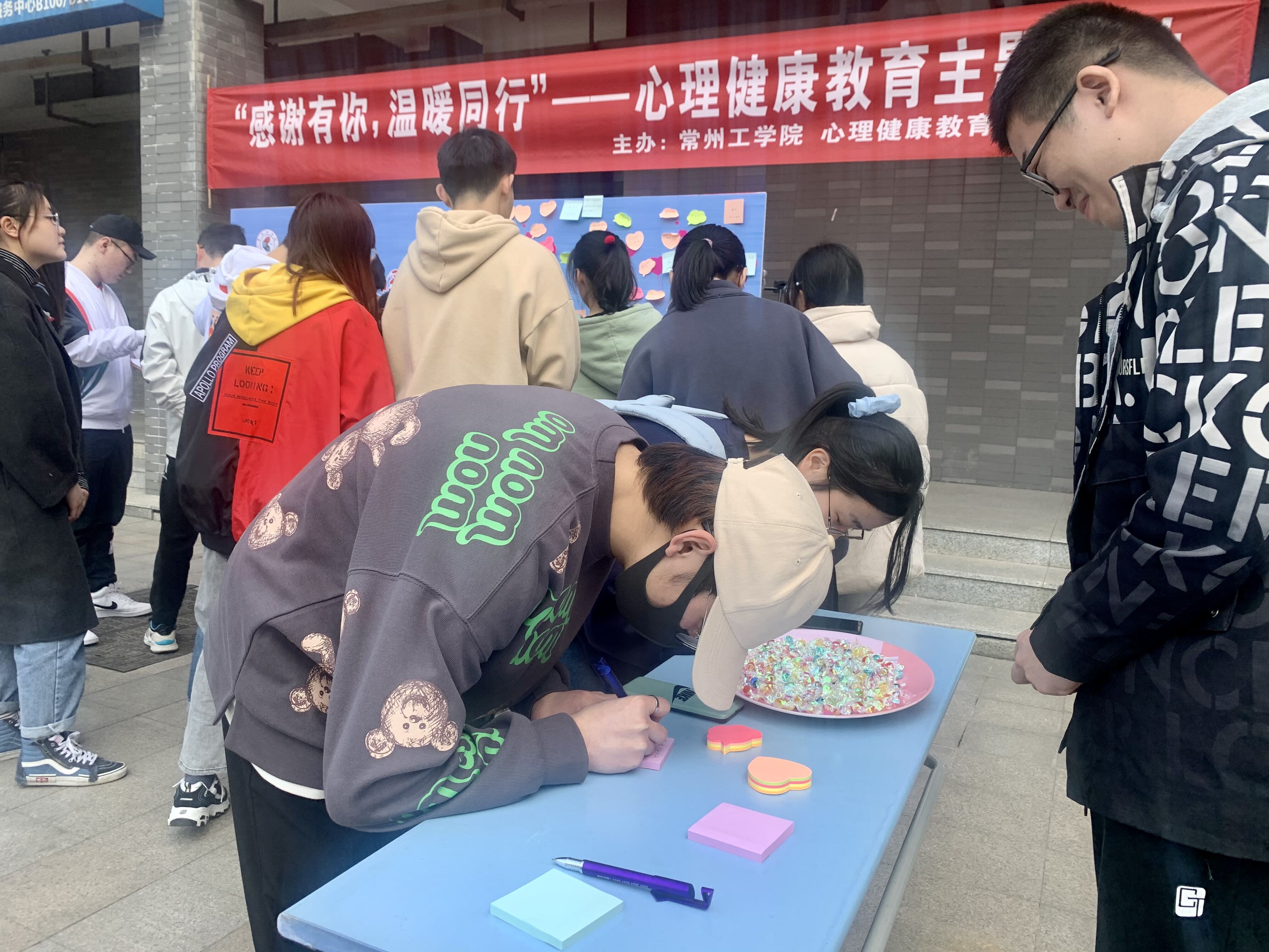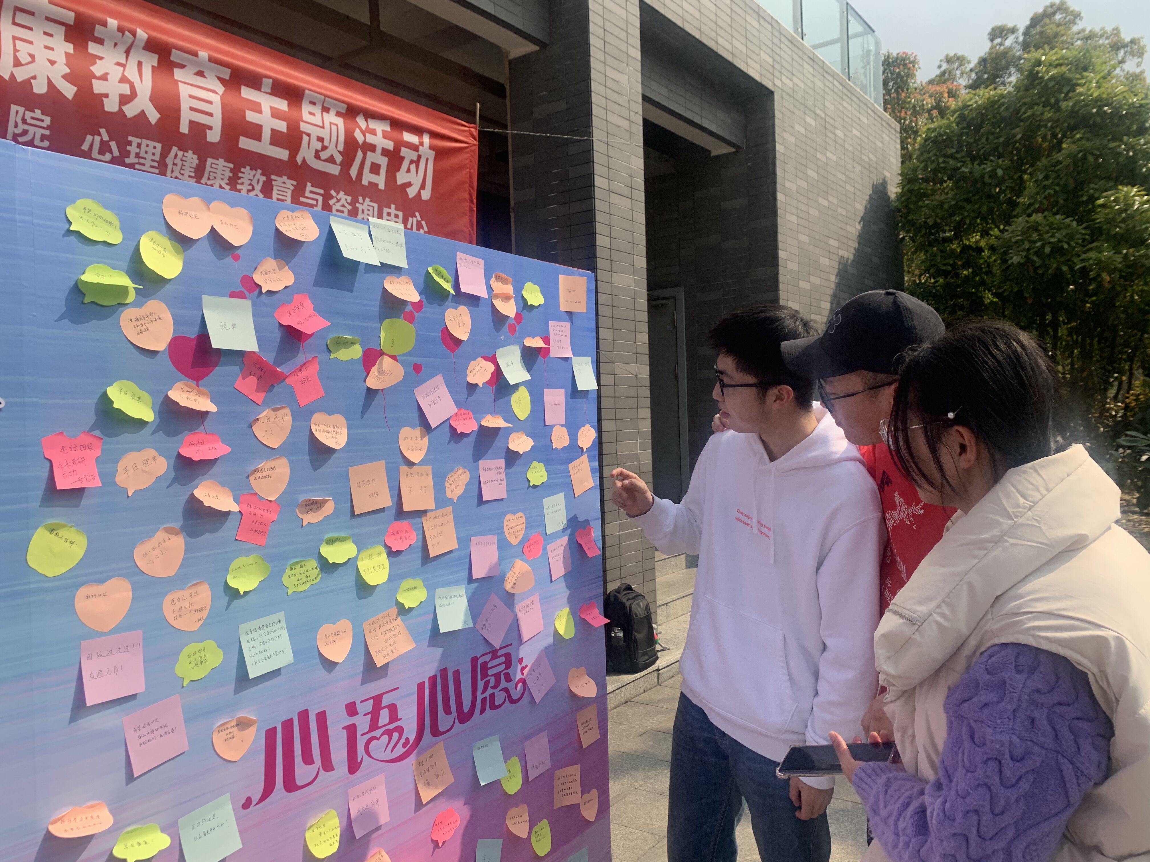 活动现场,心理健康教育与咨询中心老师和心理协会的成员一起向路过的同学发放便利贴,引导他们写下自己最近的心语心愿,并亲手粘贴到展板上,以期望得到美好的祝愿。心理协会成员也向参加活动的同学介绍本年度的心理健康教育主题系列活动,鼓励他们积极参与,得到同学们的强烈呼应。