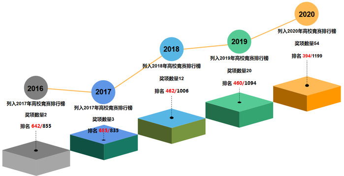 3月22日,中国高等教育学会高校竞赛评估与管理体系研究工作组发布2020全国普通高校大学生竞赛排行榜。在本科组1199个样本中,我校以全国54个奖项、总成绩49.4分,位列第394名,排名较上一年度提升66位。这是我校首次闯入全国高校学科竞赛排名TOP400以内。