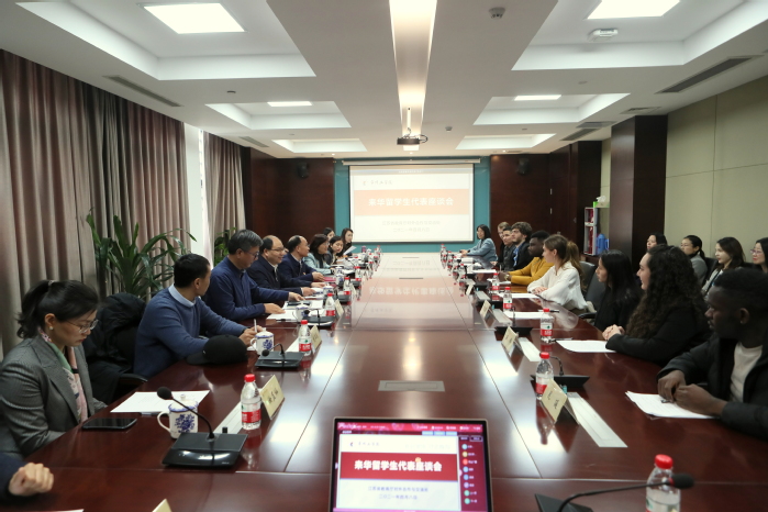 交流摸实情,寄语促实效。汪群主持来华留学生代表座谈会。会上,贺兴初充分肯定了我校国际化人才培养所取得的成绩,简要说明了联合开展主题党日活动和座谈会的目的。曹雨平介绍了我校多元立体的国家化教育格局构建的背景、取得的成绩及国际化人才培养情况。他指出,我校对来华留学生培养用心、倾注爱心,留学生不仅在我校生活愉快、学习顺心,也为地方经济社会发展和多元文化交流融合发挥了应有作用。他希望以此次党日活动为契机,促进党建与业务深度融合,使我校国际化工作、留学生教育再上新台阶。