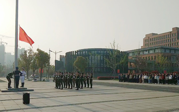 伴随着庄严的《义勇军进行曲》,五星红旗冉冉升起。在场师生面向国旗,肃穆行礼,高唱国歌,抒发拳拳爱国心和殷殷爱国情。