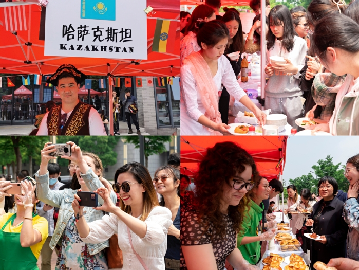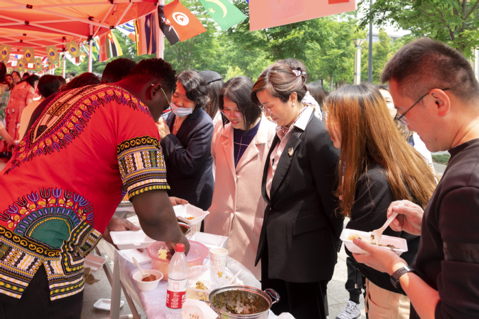 品鉴异域美食,感受“烹”然心动。来自俄罗斯、哈萨克斯坦、乌兹别克斯坦、尼泊尔、乍得、刚果(布)、巴西、印度、南非等国家的留学生精心准备了各具本国特色的菜肴、汤羹、甜点,并热情分发给前来“捧场”的中外师生。乍得咖喱牛肉、尼泊尔特色风味饺子、乌兹别克斯坦手抓饭、哈萨克斯坦鸡肉多纳卷、巴西烤肉、南非牛肉干、俄式薄饼配草莓果酱等舌尖上的美味受到了现场师生的接连点赞。