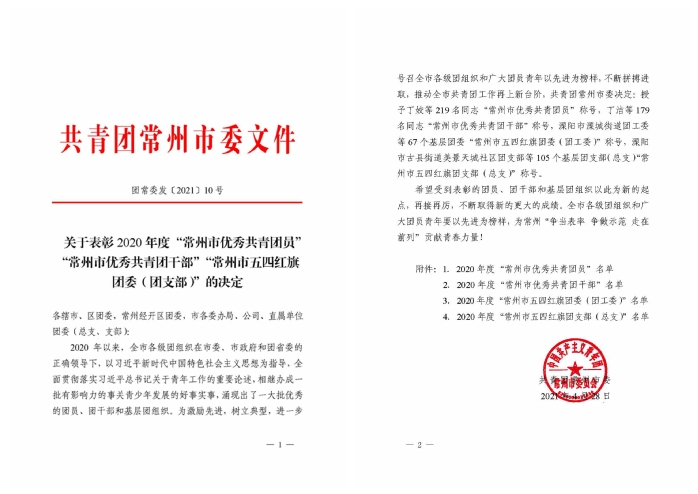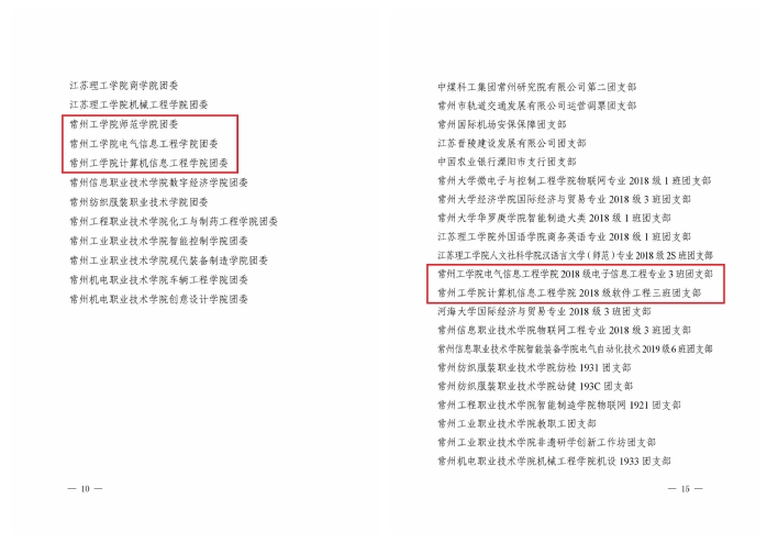 近日,从共青团常州市委《关于表彰2020年度“常州市优秀共青团”“常州市优秀共青团干部”“常州市五四红旗团委(团支部)”的决定》中获悉,我校获得多项集体荣誉。电气信息工程学院团委、计算机信息工程学院团委、师范学院团委荣获“常州市五四红旗团委”荣誉称号,2018级电子信息工程专业3班团支部、2018级软件工程3班团支部荣获“常州市五四红旗团支部”荣誉称号。