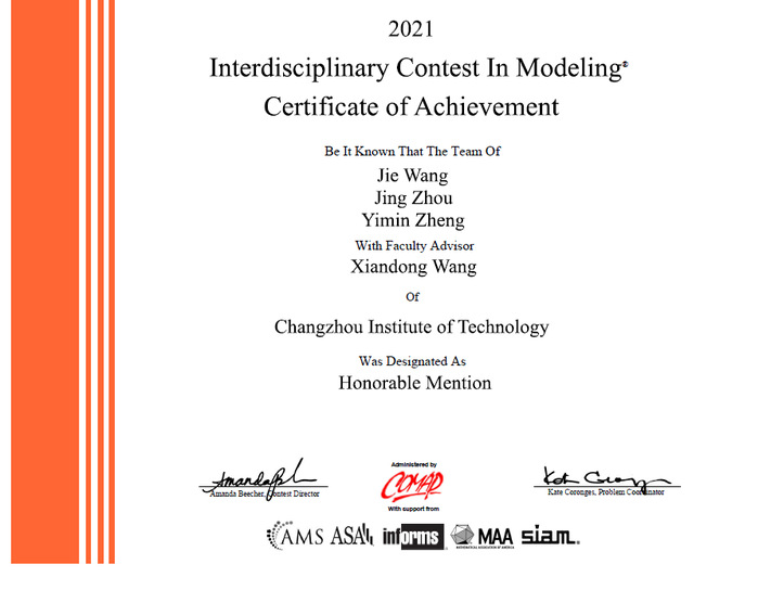 近日,2021年美国大学生数学建模竞赛(MCM/ICM)成绩揭晓,我校荣获一等奖1项、二等奖1项。其中,理学院夏红卫老师指导的陈鑫、周嘉慧、曾友获一等奖;王献东老师指导的周婧、王杰、郑伊敏获二等奖。这是继2020年在美国大学生数学建模竞赛中获国际二等奖后,我校学子在国际赛事中的又一次突破。