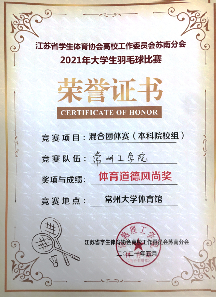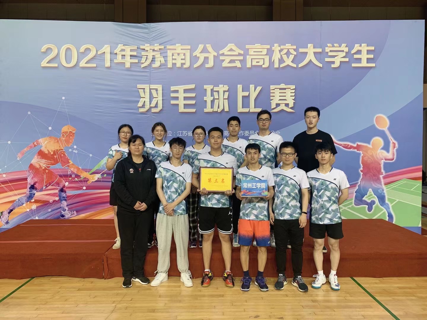 5月21日至23日,2021年苏南分会高校大学生羽毛球比赛在常州大学体育馆举行。比赛由江苏省学生体育协会高校工作委员会苏南分会主办、常州大学承办,共有来自苏南10支高校近80名运动员参赛。经过2天6场比赛激烈的角逐,最终,苏州科技大学荣获第一名、江苏科技大学获第二名、我校获第三名和体育道德风尚奖。