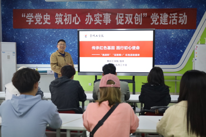 5月20日,创新创学院直属党支部开展“学党史 筑初心 办实事 促双创”党建活动。副院长饶丰以“传承红色基因 践行初心使命”为主题进行“挑战杯”“互联网+”红色活动宣讲。全体创协学生参加。