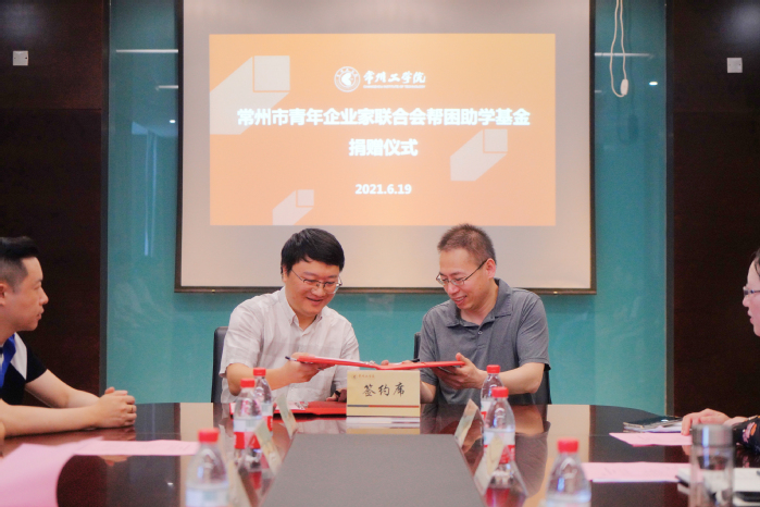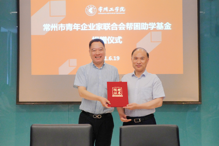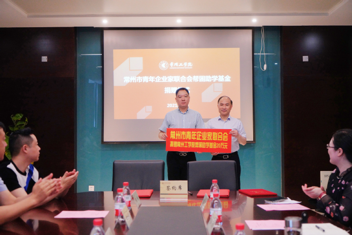 6月19 日,常州市青年企业家联合会会长、校友高旻东,副会长兼党支部书记、校友路建卫,常务副会长陈凌、副会长胡沁瑜、顾秋琴,理事许彬等一行来校,向我校教育发展基金会捐赠帮困助学基金20万元,用以支持100名家庭困难学生完成学业。校党委书记曹雨平、校党委副书记王传金及校友联谊会办公室、教育发展基金会、学生工作部(处)相关人员参加捐赠活动。王传金主持仪式。