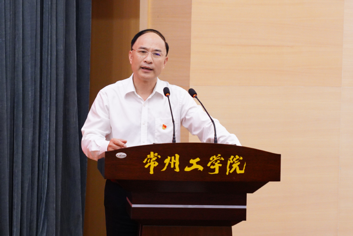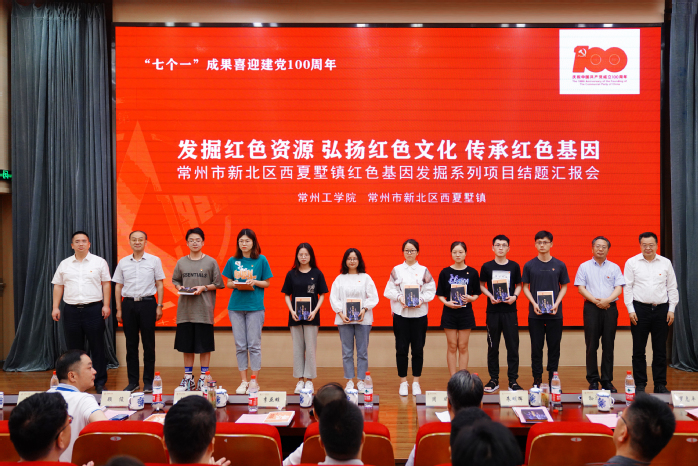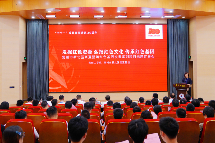 春华秋实,红色筑基。6月23日下午,我校辽河路校区行政楼辅楼二楼报告厅涌动着一股红色激流,西夏墅镇“红色基因发掘”系列项目(以下简称“项目”)结题汇报会在此隆重举行。常州市委常委、高新区党工委书记、新北区委书记周斌,常州市社科联党组书记、主席朱明辉,常州市委党史工作委员会主任李亚雄,高新区党工委委员、区委常委、宣传统战部部长孙泽阳,高新区党工委委员、区委常委、组织部部长封毅,市委党史学习教育第六指导检查组组长罗志平、副组长顾俊、成员张炜东,常州市社科联副主席叶英姿,西夏墅镇党委书记王东、党委副书记、镇长(提名)蔡刚 、人大主席言建玉,我校党委书记曹雨平、党委副书记王传金、副校长汪群,以及西夏墅镇党政领导、预备党员代表,我校相关职能部门、二级学院领导、教师和预备党员代表汇聚一堂,聆听工作汇报,观看部分成果展示,追忆峥嵘岁月,接受红色教育,汲取昂首奋进的强大动能。汪群主持会议。