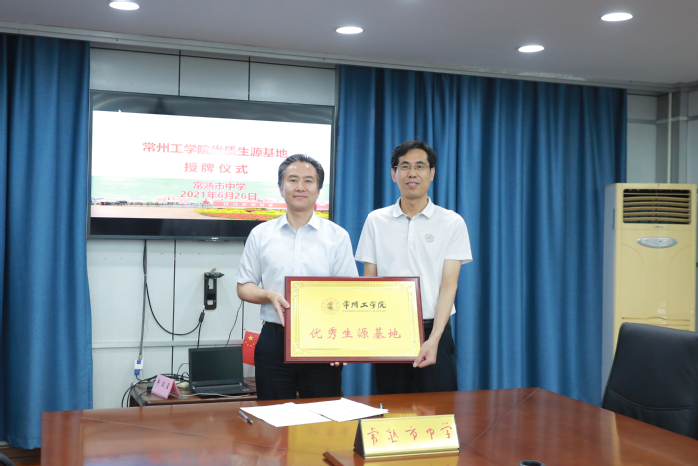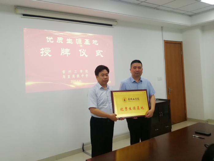 汤正华一行受到常熟市中学校长马宁等领导的热情接待。授牌仪式上,马宁结合常熟的发展历史,介绍了常熟市中学的基本情况和近几年取得的成果,阐述了学校的生源特点和近年高考录取情况。汤正华从办学理念、人才培养、专业设置、产教融合、学生就业等方面详细介绍了学校情况,希望以“优秀生源基地”签约挂牌为契机,建立深入沟通、密切联系的纽带,吸引更多优秀学生报考我校。双方围绕招生宣传等议题进行了探讨和交流,举行了优质生源基地签约和授牌仪式。