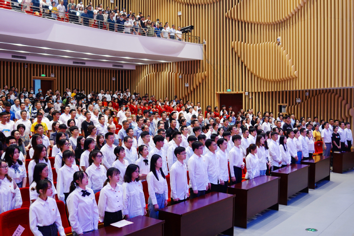 在雄壮的国歌声中,大会正式开始。在党委办公室/校长办公室主任刘春节领誓下,面对鲜红的党旗,全体师生预备党员庄严地举起右手进行入党宣誓,立下对党忠诚的坚定誓言。