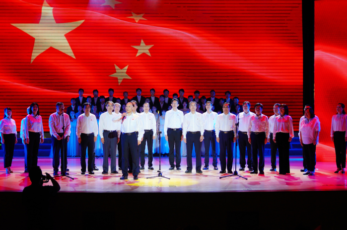 “没有共产党就没有新中国,共产党辛劳为民族,共产党他一心救中国……”全体起立,再次激情唱响《没有共产党就没有新中国》,鲜艳的党旗在师生手中挥舞,嘹亮的歌声在礼堂上空激荡,为汇演画上圆满句号。