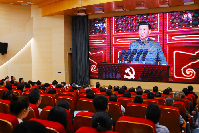 我校组织师生通过多种途径、多种形式观看了大会直播。校党委领导班子成员曹雨平、汤正华、周全法、王传金、朱海山、朱锡芳、张金贵、汪群、张兵、章瑜、王萍霞,全体中层干部、教师党员代表、学生党员代表、离退休老同志代表、各民主党派、统战团体负责人在行政管理中心辅楼二楼报告厅(主会场)集中观看庆祝大会。各基层党组织也设分会场,组织师生集中观看。许多学生自发在寝室、教室通过电脑、智能手机观看了大会盛况。
