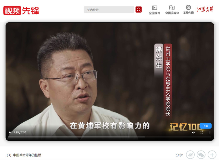 我校党委委员、马克思主义学院党总支书记、院长熊焱生在6月8日参与录制完成了《记忆100:中国革命青年的楷模》,7月6日在江苏先锋网正式发布,7月25日在江苏卫视频道首播,7月30日山东卫视频道进行了转播。