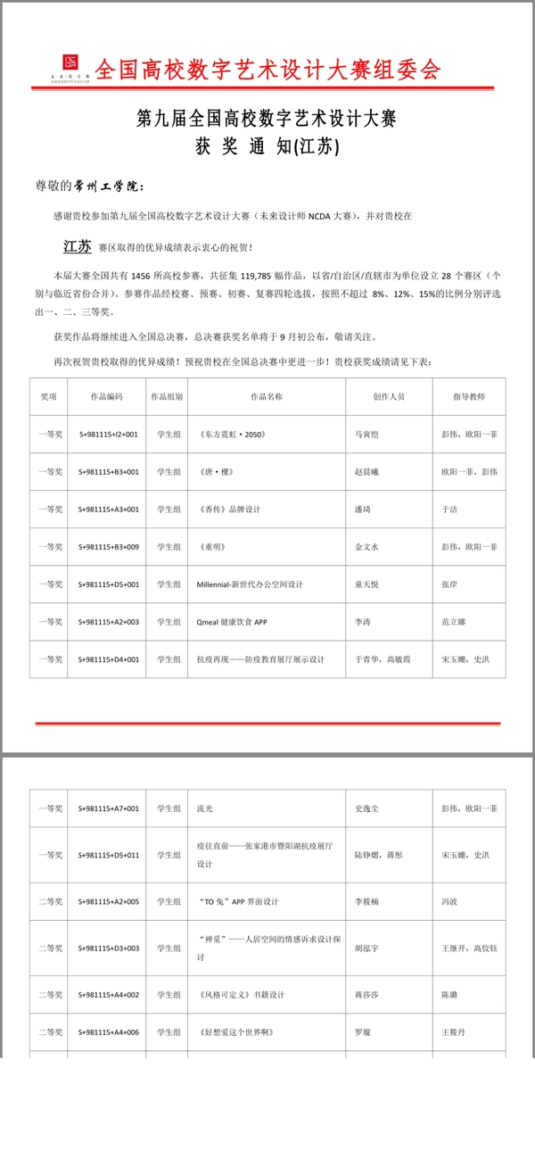 近日,第九届全国高校数字艺术设计大赛(NCDA大赛)省赛评选结果揭晓,我校学子在指导老师的悉心指导下,共获得一等奖13项、二等奖25项、三等奖20项。所有获奖作品将被直接选送国赛进行评比。获奖作品主要涉及数字影像、环境空间、视觉传达、造型设计等类别。